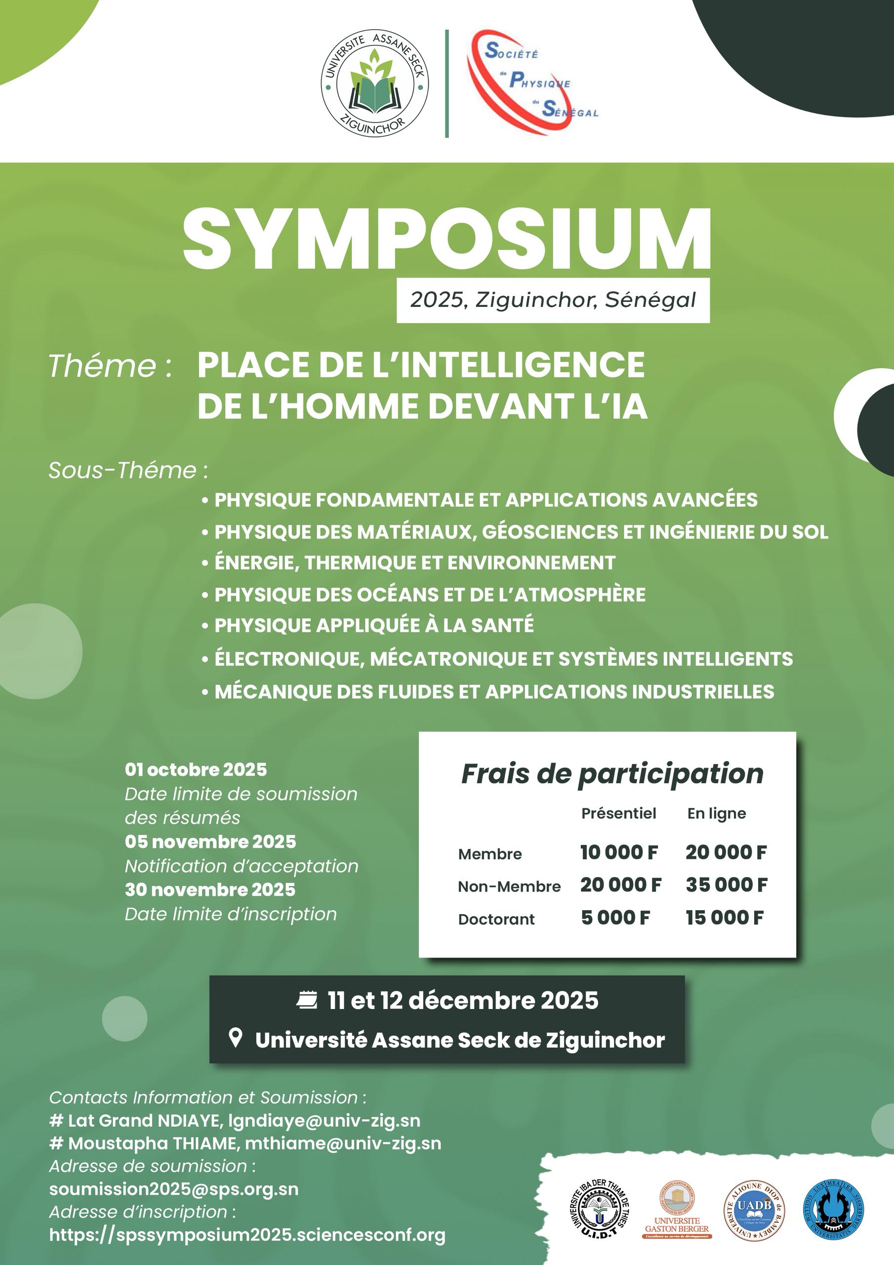 Le Symposium 2025 de la Société de Physique du Sénégal (SPS) – 3ième édition dont le thème est « Physique et IA : Place de l’intelligence de l’Homme devant l’IA », se tiendra à l’UASZ, Ziguinchor (Sénégal) du 11 au 12 décembre 2025.